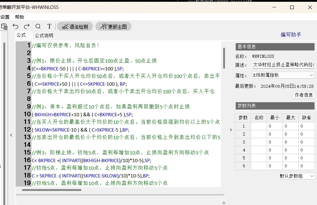 本文提供了一系列文华财经交易策略的代码示例,包括限价止损、保本止损、阶梯止损、跟踪止损、支撑/压力位止损、趋势线止损等,同时还涉及了资金管理、开仓均价等方面的内容。这些示例仅供参考,实际交易中需要根据具体情况进行调整和优化,并且要注意风险自负。